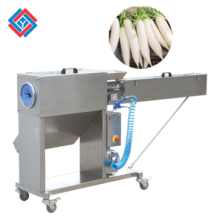 白蘿卜去皮機(jī)通過氣動(dòng)原理推動(dòng)去皮。其結(jié)構(gòu)有多組送料器及刀具組成。工作時(shí)通過夾料器校正白蘿卜后推桿推動(dòng)物料前移同時(shí)經(jīng)過環(huán)切刀實(shí)現(xiàn)脫皮的效果,脫皮的效果可根據(jù)客戶要求來調(diào)整,合格后的原料從出料口進(jìn)入下一環(huán)節(jié)。